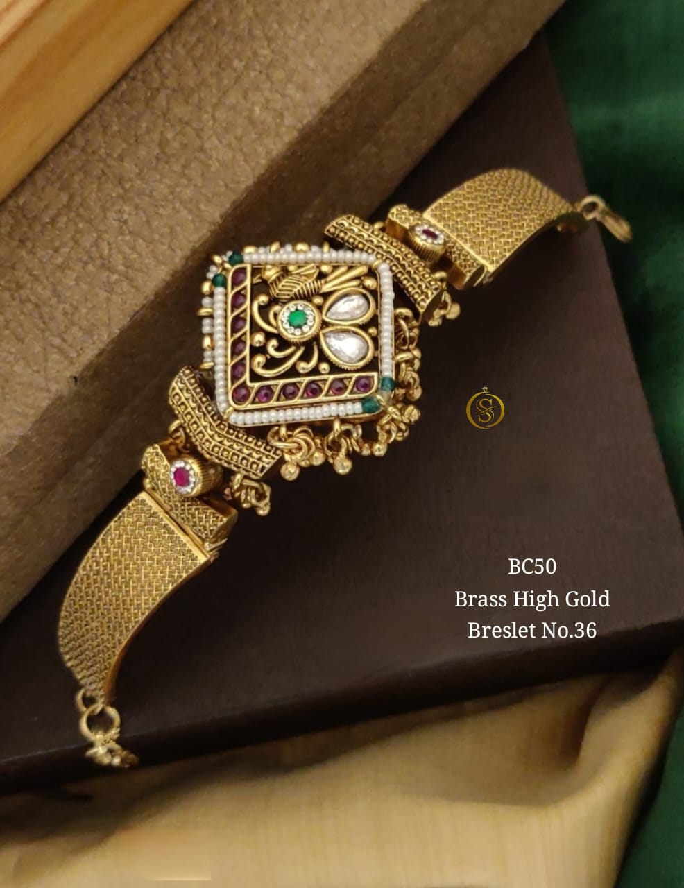 🌸 This Antique Gold Finish Temple Bracelet features a striking square centerpiece, inspired by traditional South Indian temple artistry 🛕. Crafted in brass with high gold polish, the design is enriched with sparkling kundan white stones, deep ruby-red highlights, and a radiant green center stone 💎💚.