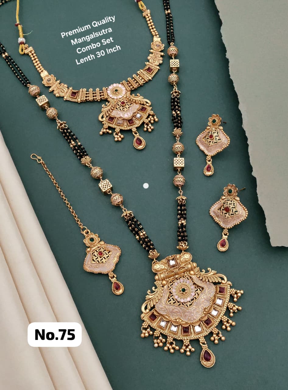Is combo set mein aapko milta hai 30 inch long mangalsutra π€, short necklace, matching earrings π, aur chain pendant, jo aapko ek complete aur graceful look provide karta hai. Black beads ke saath handcrafted square & floral motifs, aur intricately designed large pendant is set ki beauty ko aur enhance karte hain πΈ.